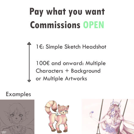 Sky background (Night and day), slightly more detailed Characters, Long hair, feathered wings: 5.00€ EACHMore complex characters, background: 10.00€I also accept DeviantArt Points and Dollar, but due to constant market changes, I don't list those prices here.